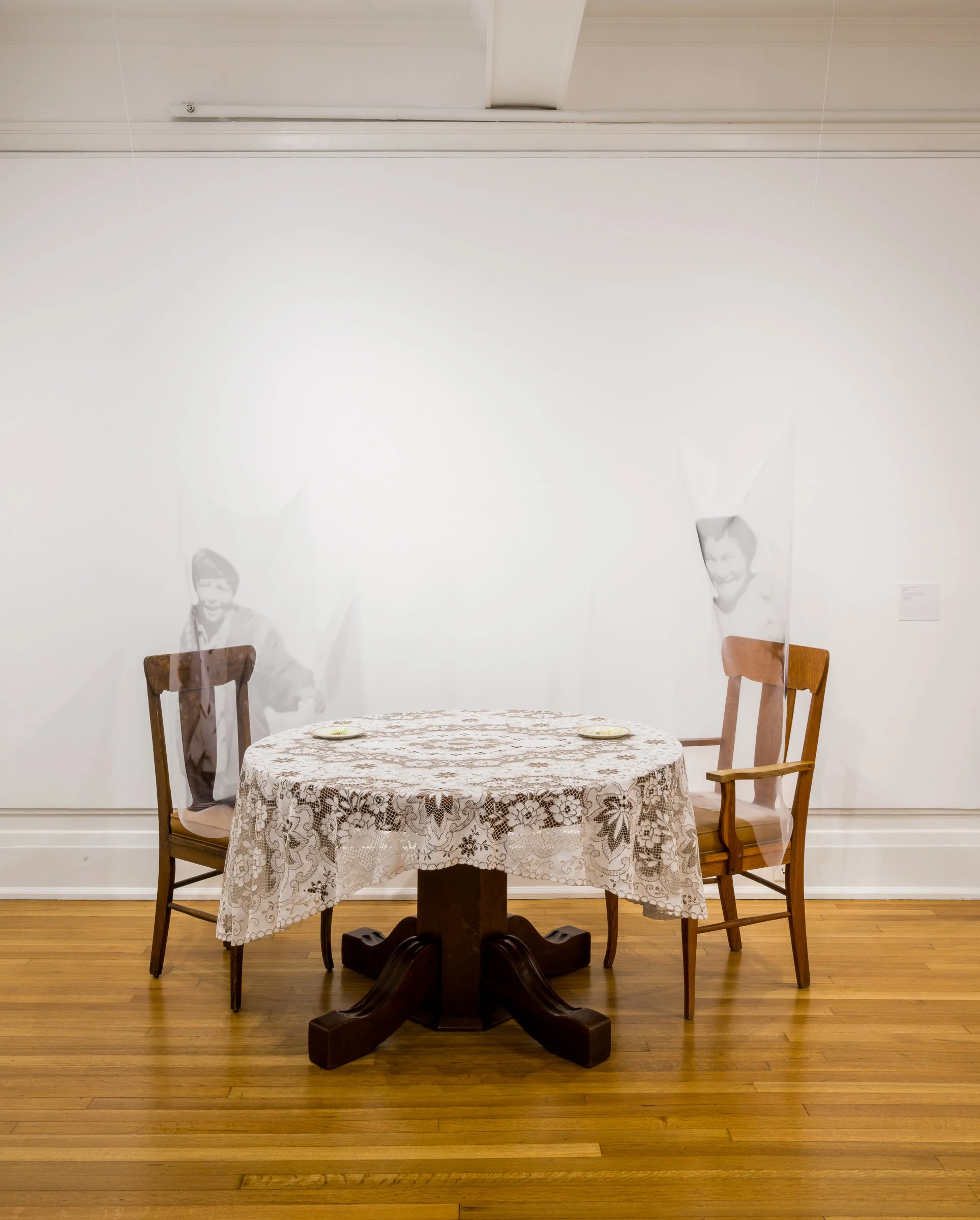 Family photographs on organza, chairs, table, lace tablecloth, ceramic plates, seed beads, and tobacco.
